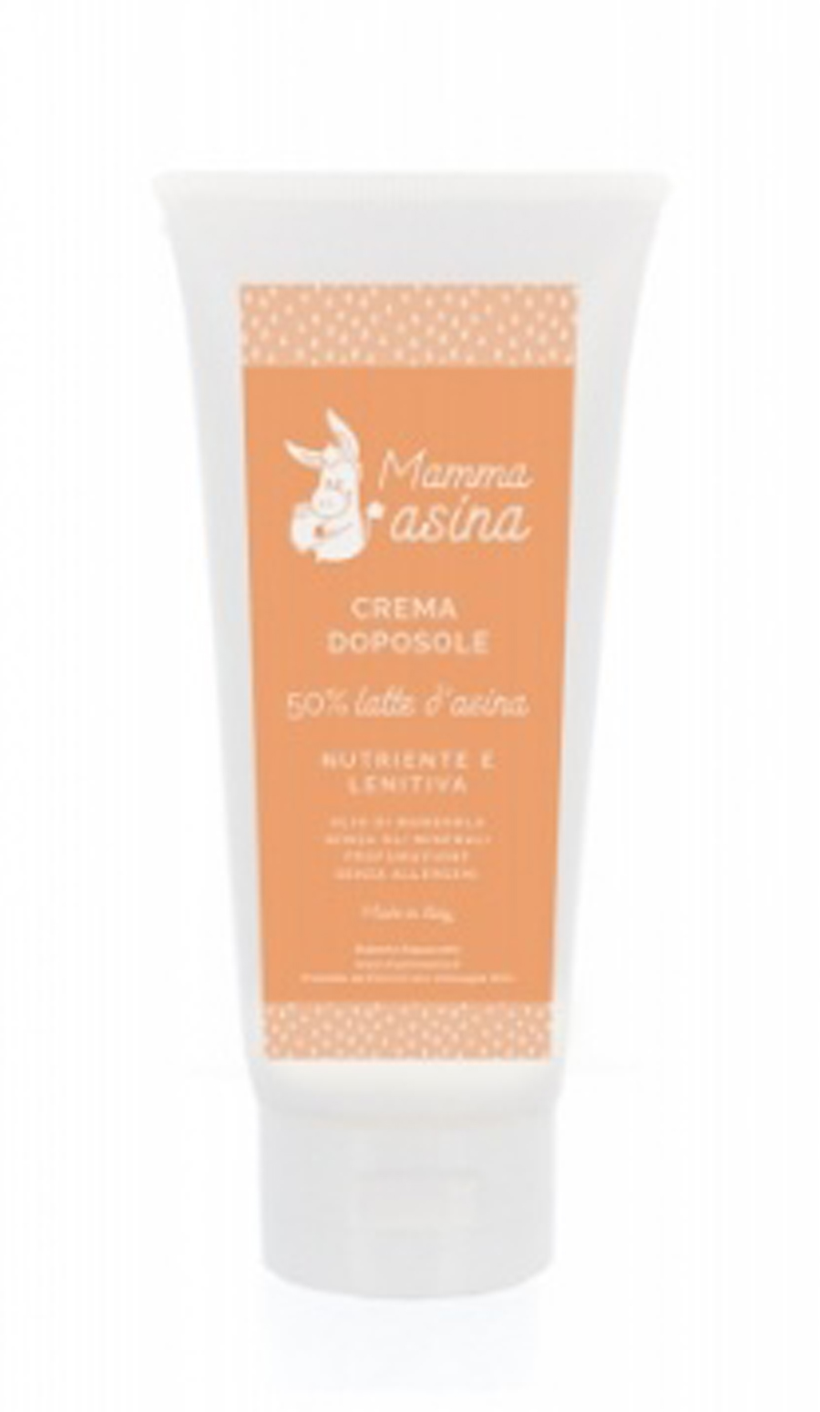 La crema doposole Mamma Asina contiene Latte d’Asina ad alta concentrazione e preziosi oli vegetali dall’azione filmante ed elasticizzante (burro di karitè e olio di mandorle). L’olio di mallo di noce contribuisce ad esaltare il colore dell’abbronzatura, mentre l’acido glicirretico e l’estratto di elicriso favoriscono l’azione lenitiva dai rossori dovuti all’esposizione al sole.